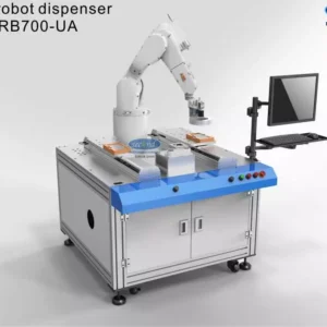 This is automated industrial adhesive material dispensing robot works with two working shuttles dispensing robot SEC-NRB700-UA