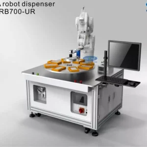 This is automated industrial adhesive material dispensing robot works with turntable dispensing robot SEC-NRB700-UR