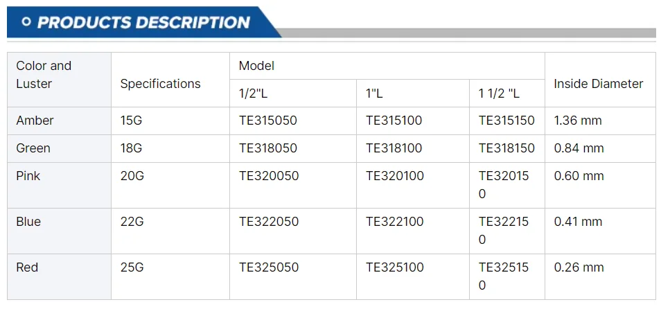 | Green | 18G | TE318050 | TE318100 | TE318150 | 0.84 mm |