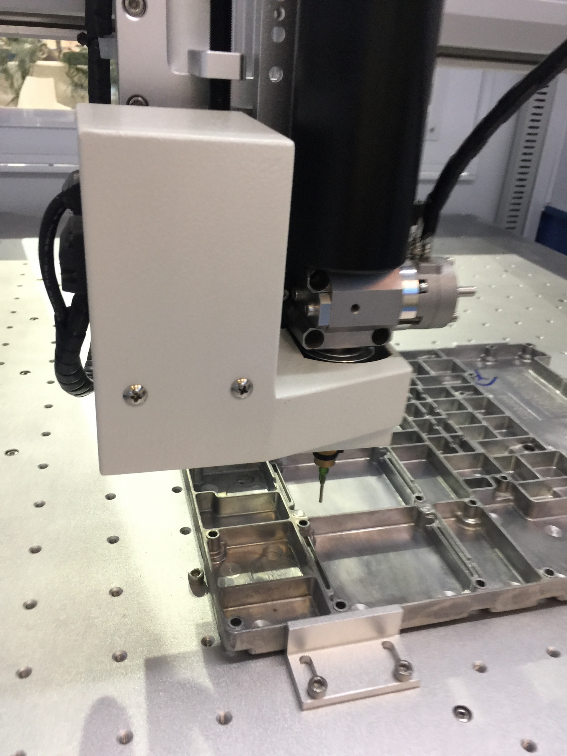 This dispensing machine equips with unique dispensing system that allows to dispensing EMI, EMC triangular or D-shape shielding gasket directly on the aluminum casting plate.
