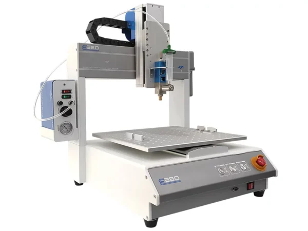 This is a popular 30cc syringe automatic glue dispenser, it equips with a flexible, and user-friendly filling system, allowing to use of 3cc to 50cc syringes sizes. Simply install the syringe on the mounting bracket, tighten up the lock, and connect the air-pressure controller, set dispensing trajectory, and parameter, you are ready to dispense. This is an E380 desktop dispenser, it is of good quality and with high dispensing precision, with its flexibility, it is most welcome in EMS factories for appl UV, red glue, solder paste, epoxy, and another adhesive on electronic PCB, chips, LCD screen, cellphone case, parts, and other components