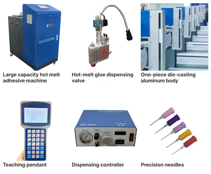 Second Intelligent provides a full range of hot melt adhesive spraying solutions. The SECOND system hot melt adhesive spraying system adopts touch screen-human-machine interface full control operation, which is suitable for high-precision hot melt adhesive spraying applications. The motor drives the precision gear pump and the glue output automatic tracking system, and is equipped with precision gear pumps of different specifications to meet the production needs of users. It is widely used in spraying, coating, scraping and other methods.