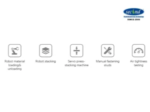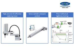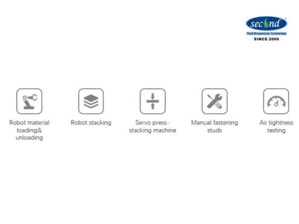 The goal of designing the screw stacking line is to develop a fully automatic assembly line for the stacking and assembly of PEM hydrogen fuel cell screw stacks. The loading and unloading of wire/cable and materials is achieved by robots. The stacking of stack end plates, current-collector plates, bipolar plates and other materials is completed by robots. The high-precision servo pressing system to ensures the precise pressure of the stack, the CCD visual alignment system ensures the accuracy, the studs are manually locked, and the multi-directional air tightness test of the stack is carried out by the flow method accurately.