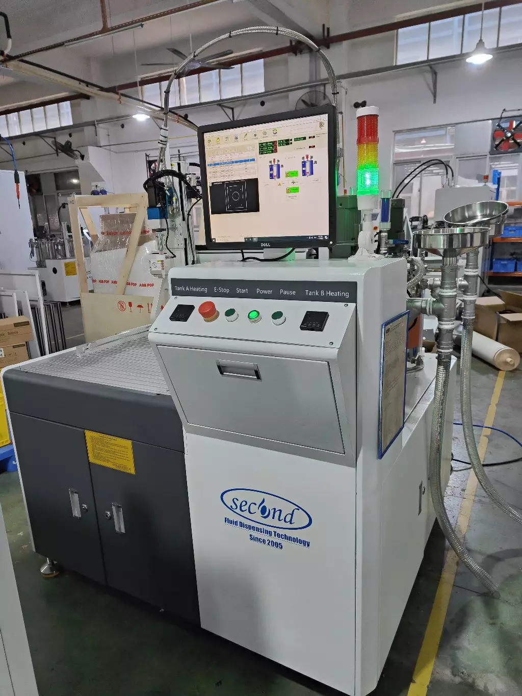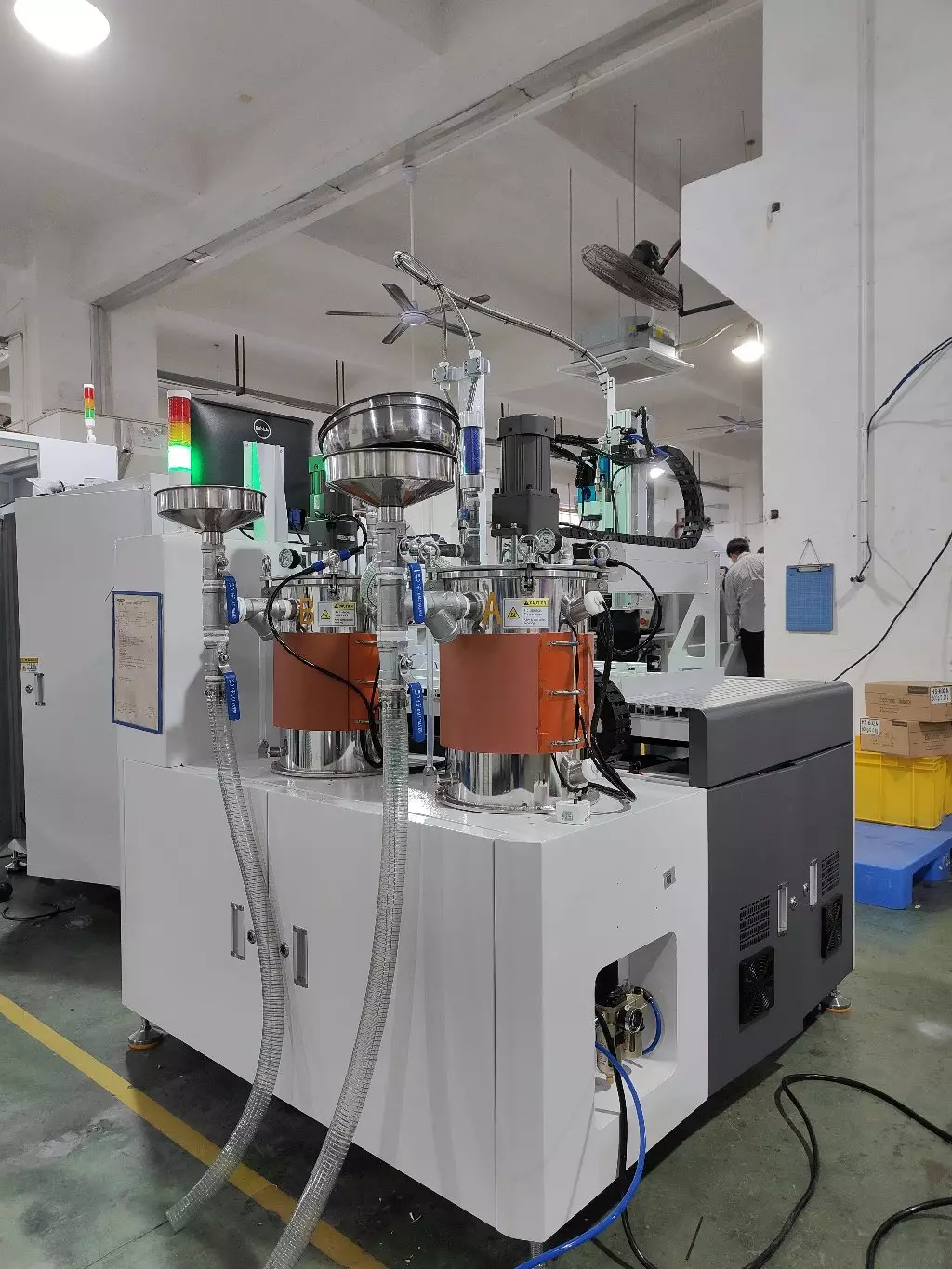 Two parts silicone, resin, epoxy, polyurethean and other fluids with big tanks or barrels of materials.